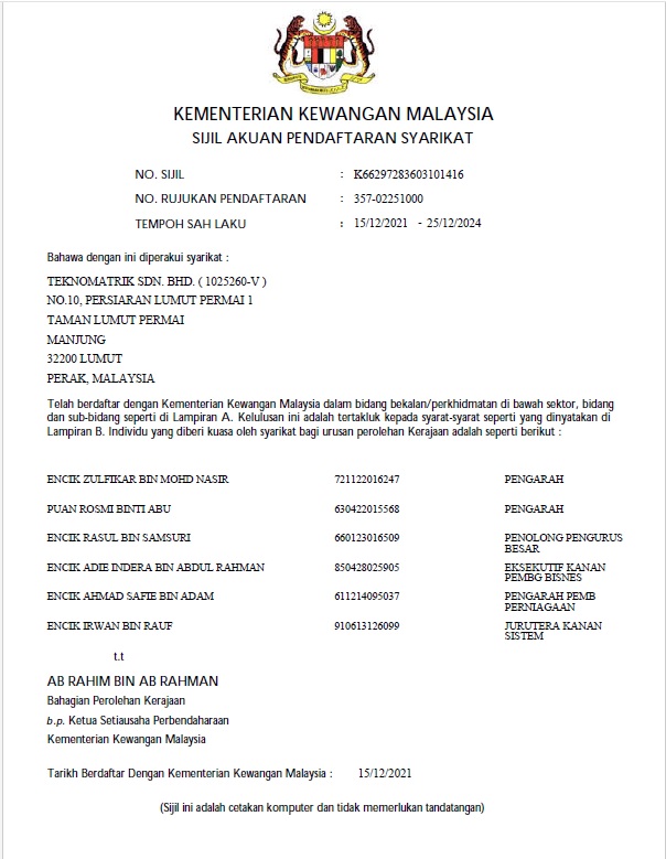 Certified ISO 9001 And Registered With Ministry Of Finance Malaysia